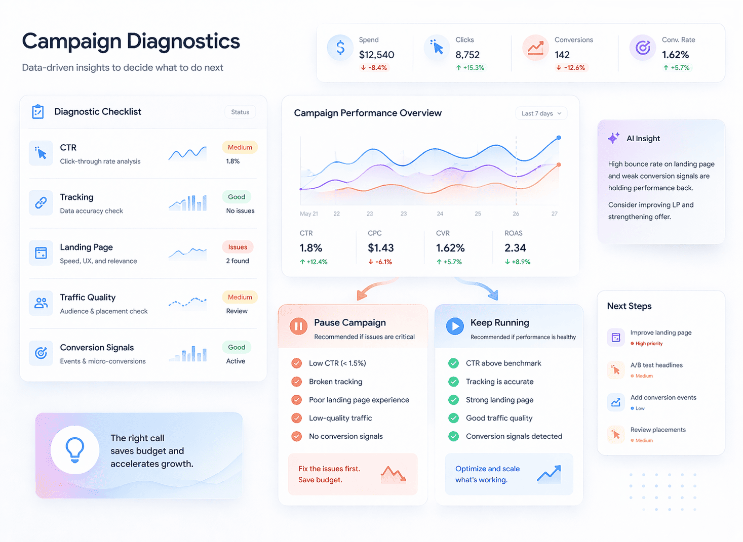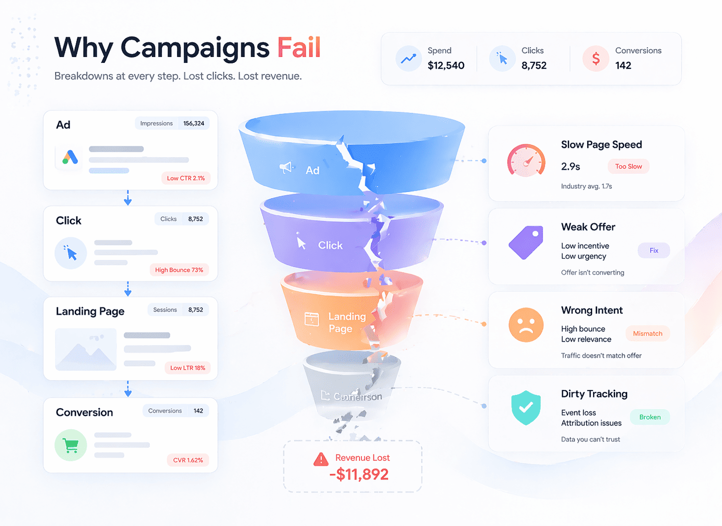 العرض ضعيف. زاوية الإعلان تفتقد القصد. الصفحة المقصودة تسرب المستخدمين. التتبع يرسل إشارات قذرة.
